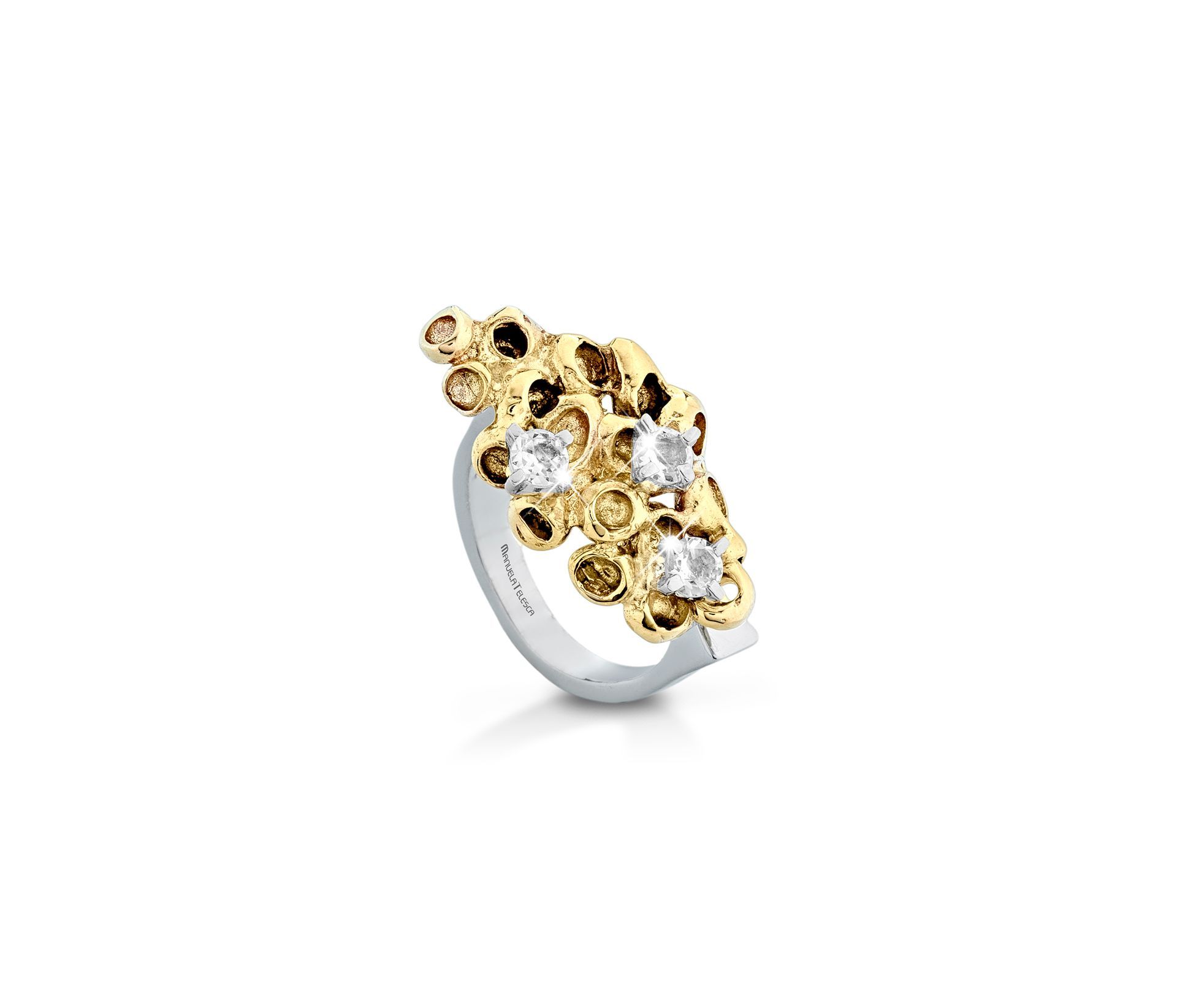 Anello in bronzo, argento e topazi bianchi con bagno oro 18 carati