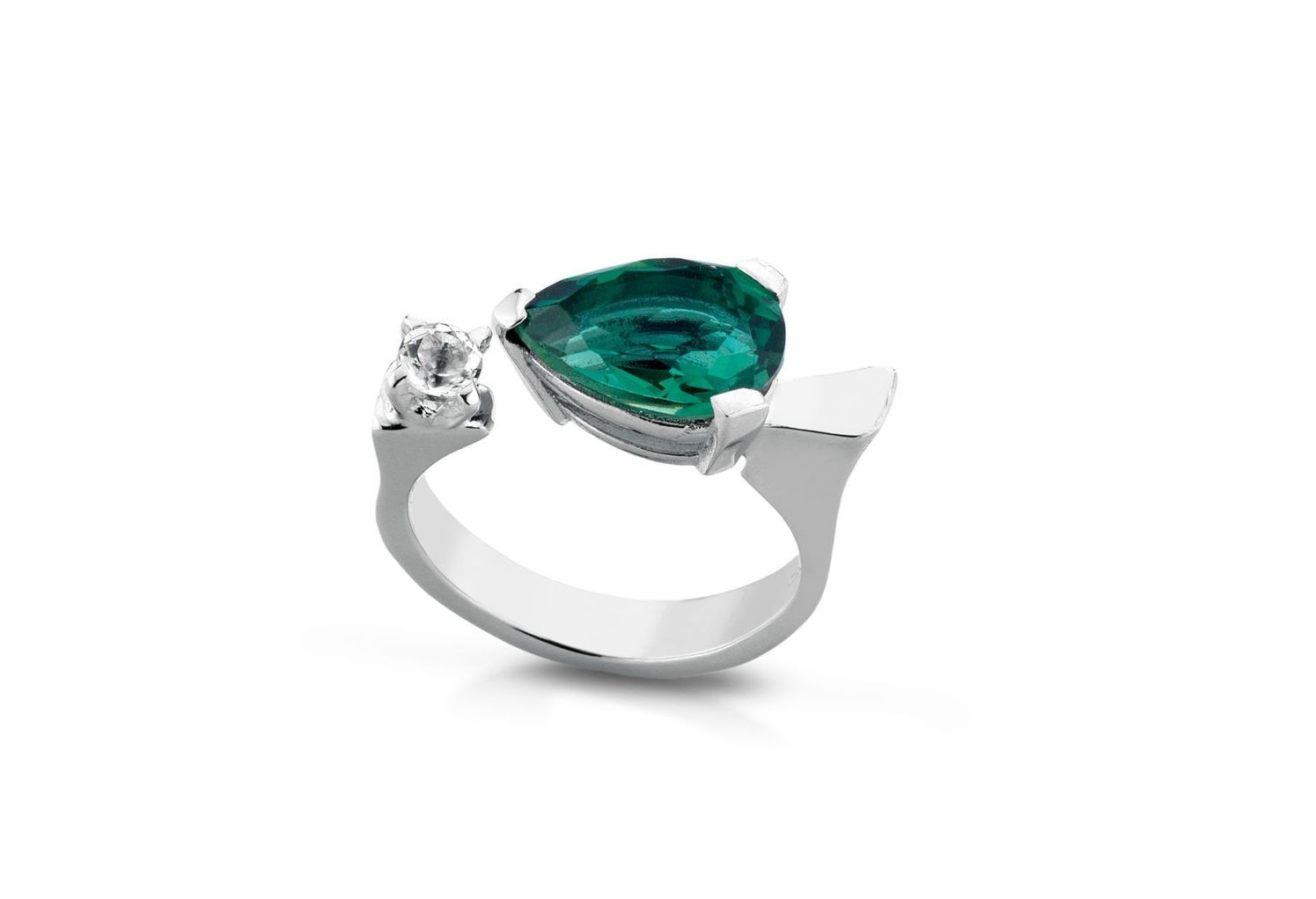 SILVER, BRONZE, DIAMOND AND EMERALD RING